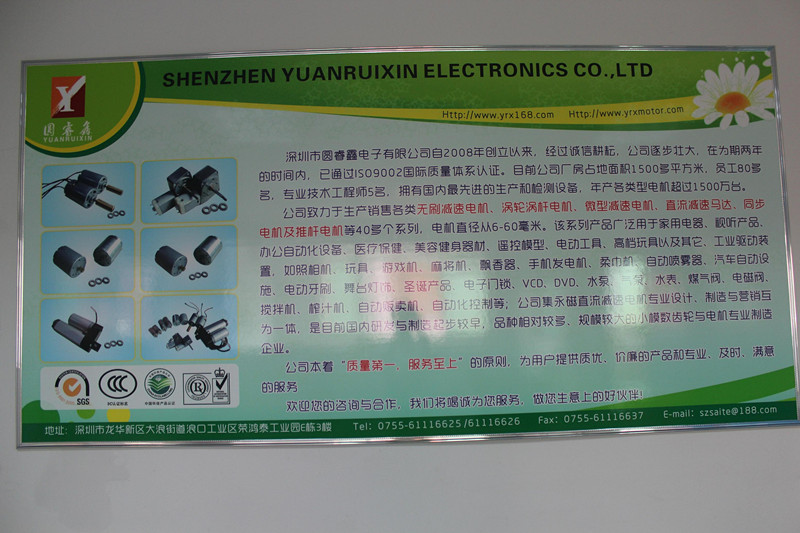 深圳市圓睿鑫電子有限公司自2008年創(chuàng)立以來(lái),經(jīng)過誠(chéng)信耕耘,在為期兩年的時(shí)間內(nèi),已通過ISO9001:2000國(guó)際質(zhì)量體系認(rèn)證。公司廠房占地面積2000多平方米,員工100人,專業(yè)技術(shù)工程師6名,擁有國(guó)內(nèi)最先進(jìn)的生產(chǎn)和檢測(cè)設(shè)備,年產(chǎn)各類減速電機(jī)超過2~300萬(wàn)臺(tái)。因公司發(fā)展需要,于2020年底,將生產(chǎn)基地遷往擁有最美小鎮(zhèn)之稱的東莞市清溪鎮(zhèn),依山傍水,依托美麗的大自然環(huán)境和地方文化,全新的東莞市圓睿鑫電子有限公司將借助深圳母公司平臺(tái),一步步走上新的臺(tái)階。 東莞公司將繼續(xù)致力于生產(chǎn)銷售各類無(wú)刷減速電機(jī) 渦輪渦桿電機(jī),微型減速電機(jī),直流減速馬達(dá),交流手搖發(fā)電機(jī)、同步電機(jī)及空心杯電機(jī)等,電機(jī)直徑從6-60毫米為定位,系列產(chǎn)品廣泛用于智能家電、智能辦公自動(dòng)化設(shè)備、智能醫(yī)療、美容健身器材、遙控模型、電動(dòng)工具、高檔玩具以及其它工業(yè)驅(qū)動(dòng)裝置,如高檔玩具、游戲機(jī)、麻將機(jī)、飄香器、手機(jī)發(fā)電機(jī)、柔巾機(jī)、自動(dòng)噴霧器、汽車自動(dòng)設(shè)施、電動(dòng)牙刷、舞臺(tái)燈飾、圣誕產(chǎn)品、智能電子門鎖、VCD、DVD、水泵、氣泵、水表、煤氣閥、電磁閥、攪拌機(jī)、榨汁...